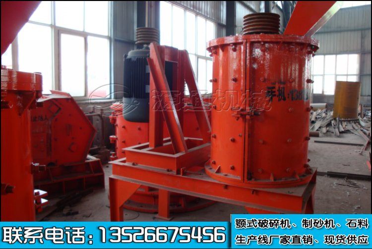 主軸通過向心 調(diào)正滾動軸承安裝在機(jī)體上,其軸向力由球面滾珠推力軸承承受,主軸上一般用鍵聯(lián)接 若干排錘架,錘架上裝有錘頭。立軸反擊式一般只有兩排錘,中間有隔盤,把破碎機(jī)分成上 下兩個(gè)破碎腔,即破碎腔和擠壓破碎腔。所要破碎的物料由機(jī)器上部垂直落入高速旋轉(zhuǎn)的葉輪內(nèi),在高速離心力的作用下,與另一部分以傘狀形式分流在葉輪四周的物料產(chǎn)生高速撞擊與粉碎,筒體內(nèi)壁裝有斜形齒的反擊板。塊狀物料由進(jìn)料口 進(jìn)入第一破碎腔落到錘架上,被高速旋轉(zhuǎn)的轉(zhuǎn)子加速,使物料獲得足夠的動能,在離心力的 作用下,飛向周邊,撞擊在筒體的反擊板上,被沖擊破碎及反彈,又被高速旋轉(zhuǎn)的板錘撞擊粉碎。部分物料與高速旋轉(zhuǎn)的轉(zhuǎn)子一起作回轉(zhuǎn)運(yùn)動,在回轉(zhuǎn)運(yùn)動中,物料相互碰撞,擠壓后 而被進(jìn)一步粉碎后自然下落到隔盤上,在落到第二排錘架上,再次發(fā)生上述沖擊、撞擊、擠壓,該機(jī)是屬通過式粉碎。物料在互相撞擊后,又會在葉輪和機(jī)殼之間以物料形成渦流多次的互相撞擊、摩擦而粉碎,從下部直通排出,形成閉路多次循環(huán),由篩分設(shè)備控制達(dá)到所要求的成品粒度。